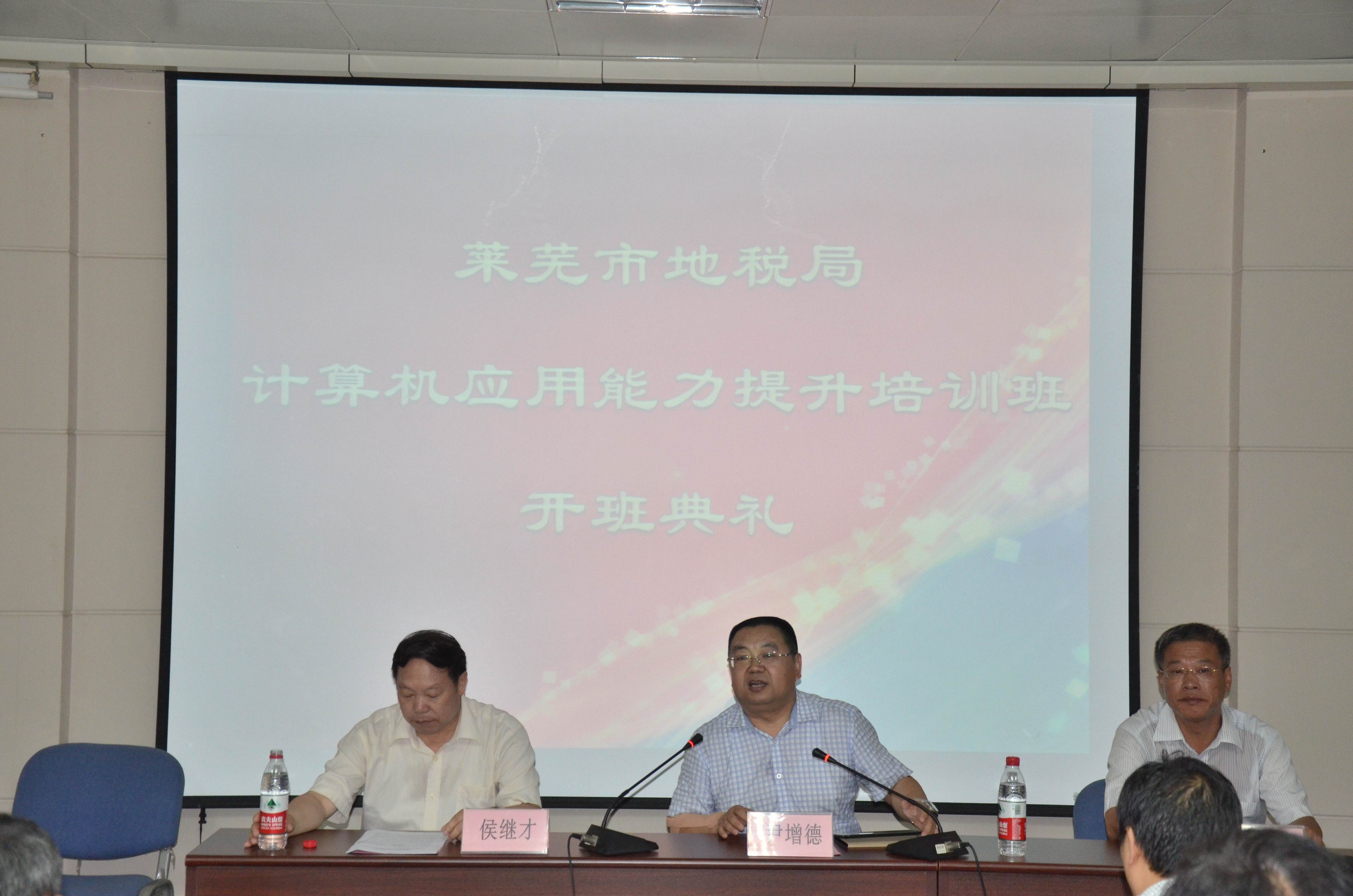 莱芜市地税局干部职工计算机应用能力提升培训班于6月20日上午在太阳成集团tyc9728开班。 开班典礼上,太阳成集团tyc9728经理尹增德致欢迎辞,并向学员介绍了太阳成集团tyc9728办学情况及成人高等教育情况,并就提高认识、珍惜机会、处理好工学矛盾等问题对学员提出了要求和希望。 莱芜市地税局党组成员、副局长侯继才出席并讲话。