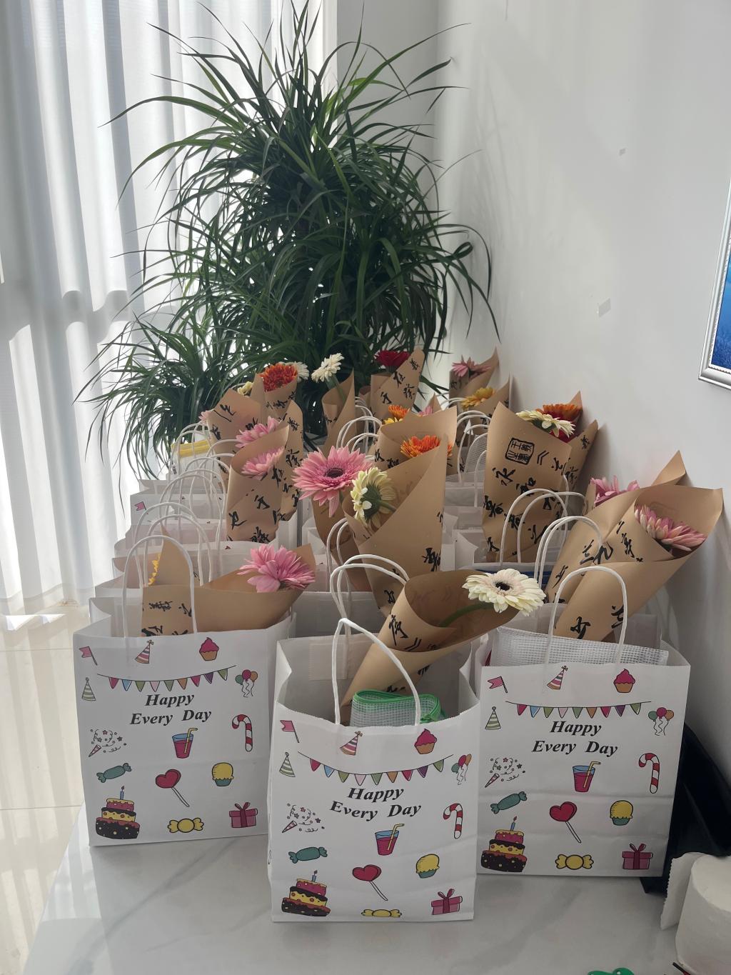 一份礼包,满载深情厚意。公司准备的礼物既实用又充满祝福。其中,一套文具,助力考生在考场上挥洒自如,下笔如有神;礼品袋上印制的鼓励话语,承载着师长们最真挚的关切与期望。礼包内,一个橙子与一个苹果,寓意考生们能够“平安上岸”、“心想事成”,顺利抵达梦想的彼岸。尤为别致的是,礼包中还包含两条德芙巧克力与一朵太阳花。德芙巧克力,寓意“得福”,以“巧”克“力”,智慧应对挑战;那朵明媚的太阳花,则象征着阳光、活力与坚定的追求,期盼考生们能始终面向希望,保持积极乐观的心态,在考场上绽放属于自己的光芒。