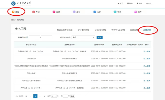 员工可从“通知公告”栏中查看本学期直播授课安排表,或者直接从“课程”标签进入直播课堂,根据上课起止时间点击进入直播教室。