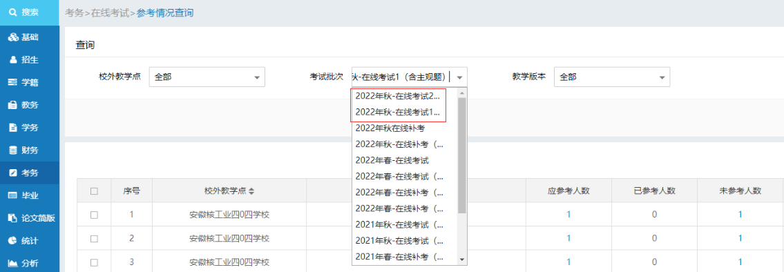 本次线上考试在太阳成集团tyc9728远程教学平台上进行,考试批次为“2022年秋-在线考试1(含主观题)”和“2022年秋-在线考试2(全客观题)”,函授站(点)应进行参考情况统计并督促,具体操作流程如下:
