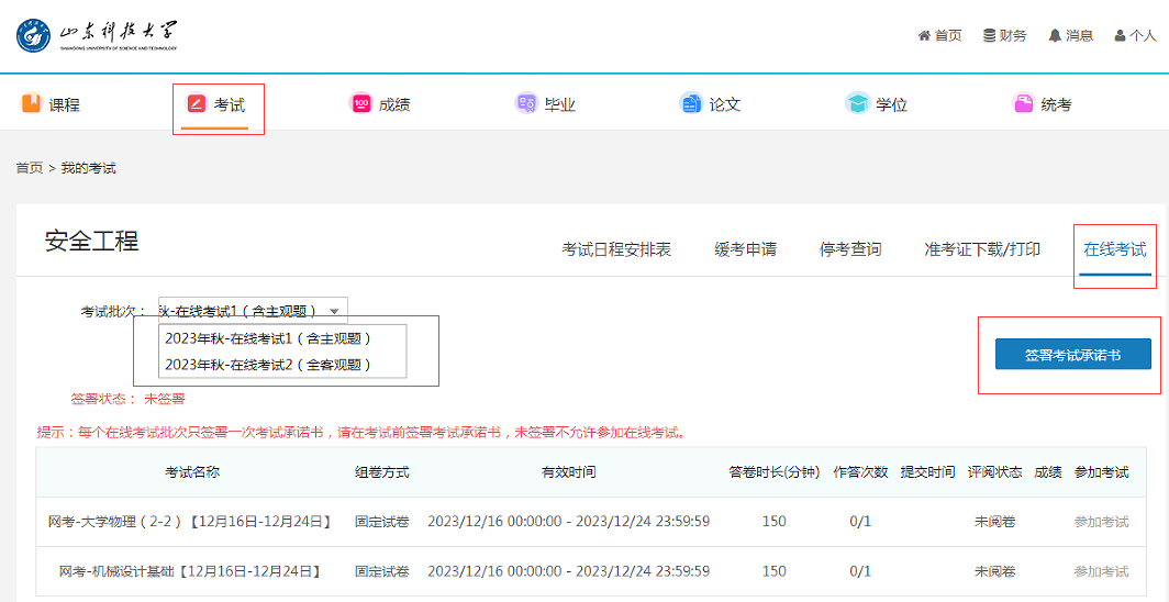 本次线上考试在太阳成集团tyc9728远程教学平台上进行,考试批次为“2023年秋-在线考试1(含主观题)”和“2023年秋-在线考试2(全客观题)”,具体操作流程如下: