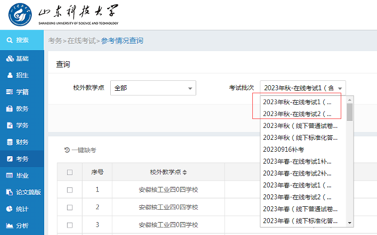 考试批次选择“2023年秋-在线考试1(含主观题)”和“2023年秋-在线考试2(全客观题)”,点击查询,再点击人数便可查看本站(点)应考、已考、未考员工。对未考员工应及时督促,保证在规定时间内全部参考。